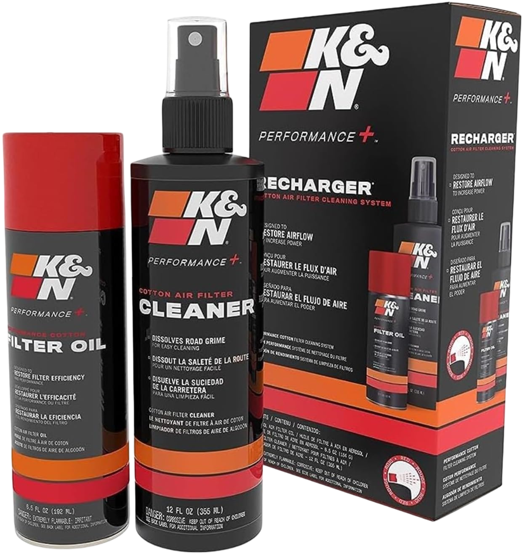 The K&N filter cleaning kit consists of: 1 bottle of cleaning fluid (355 ml) and a 200 ml spray can of filter oil